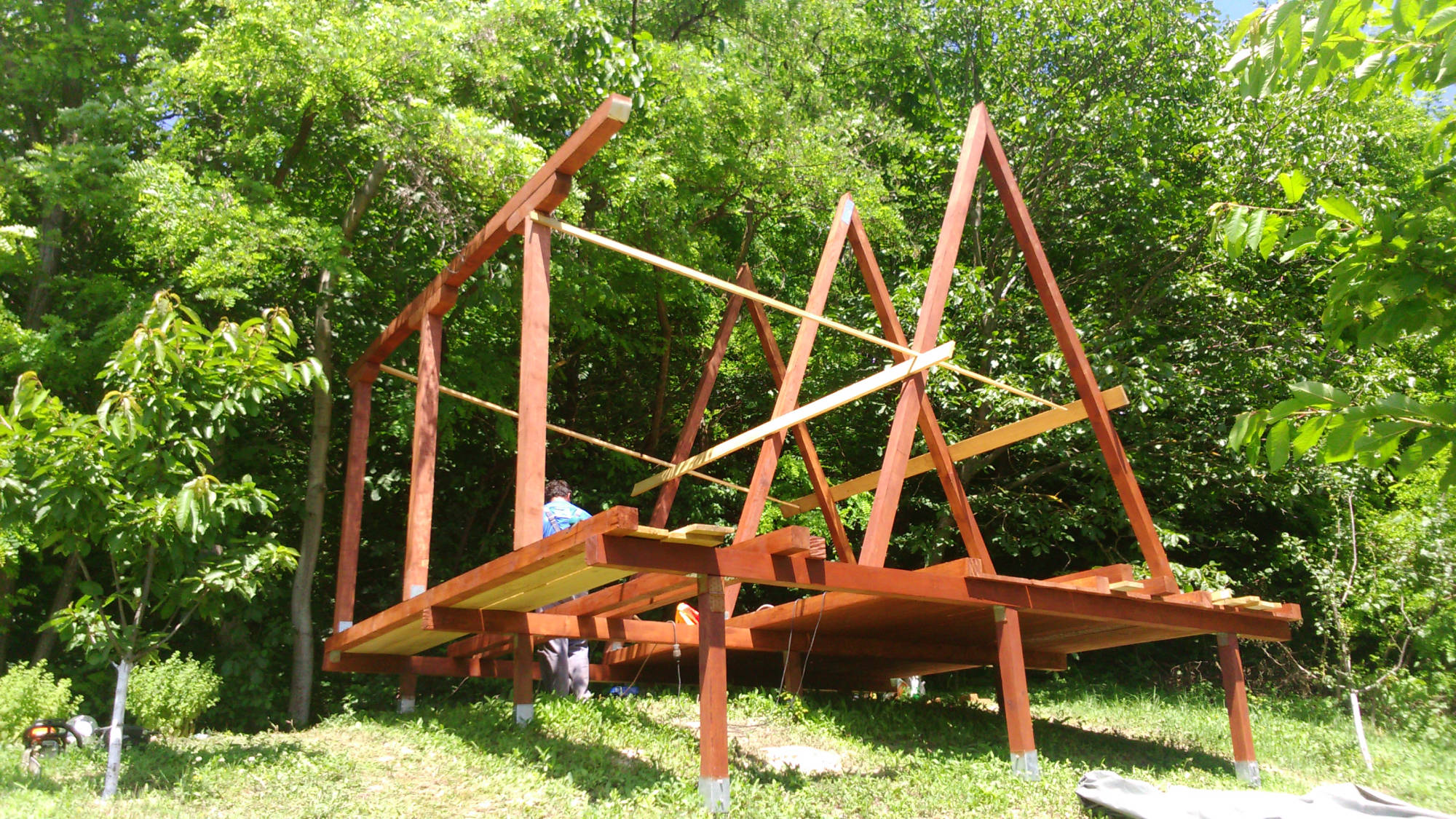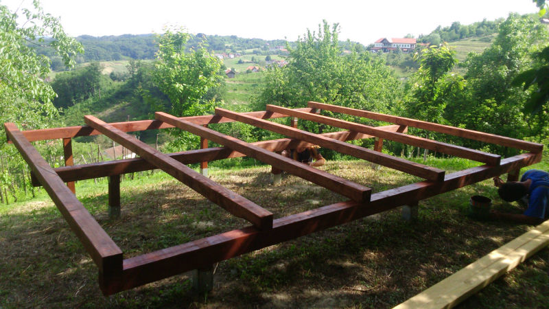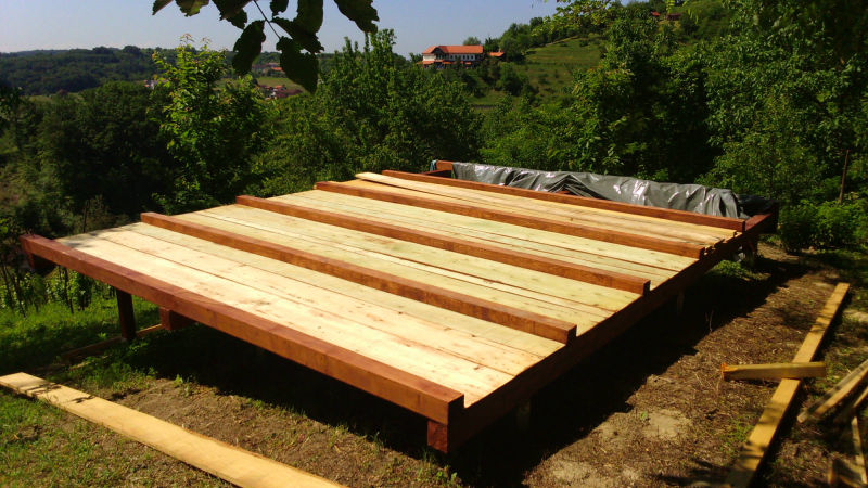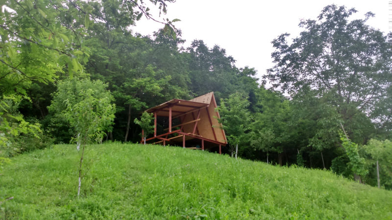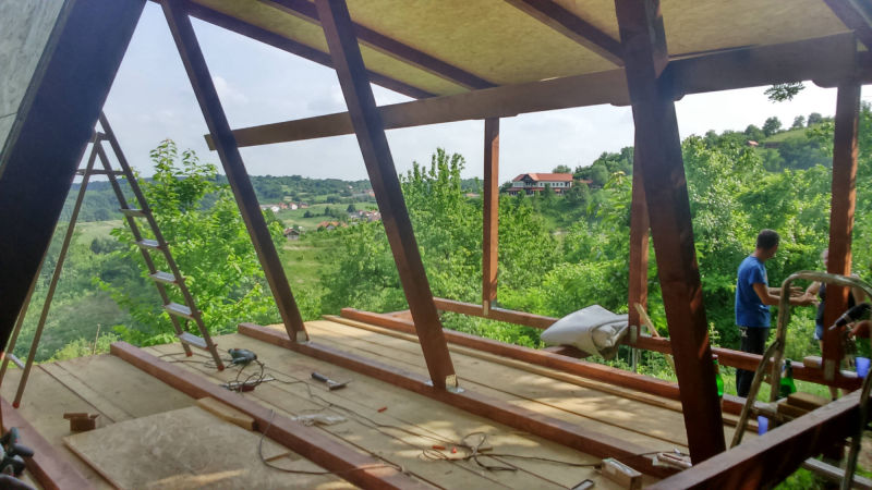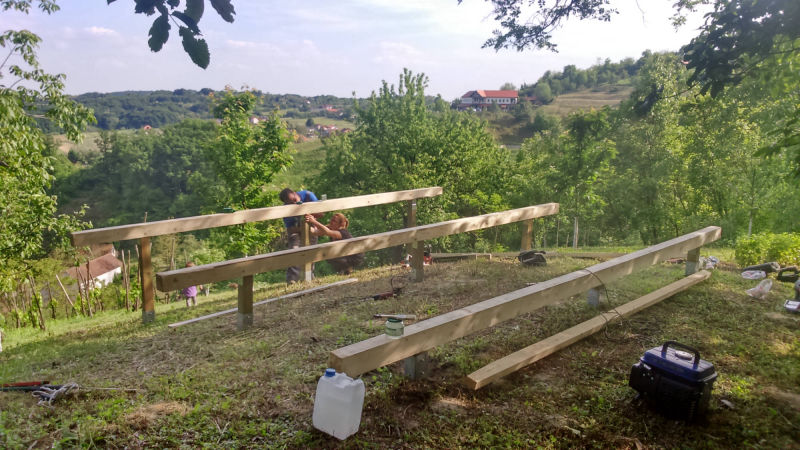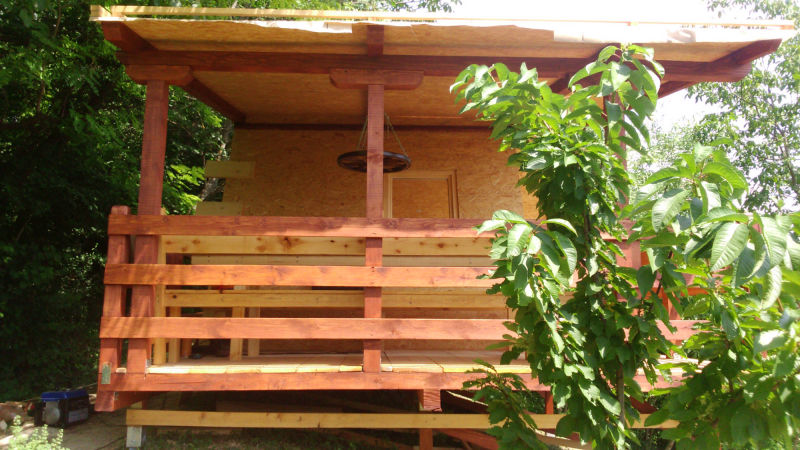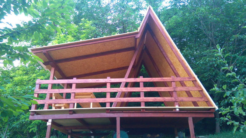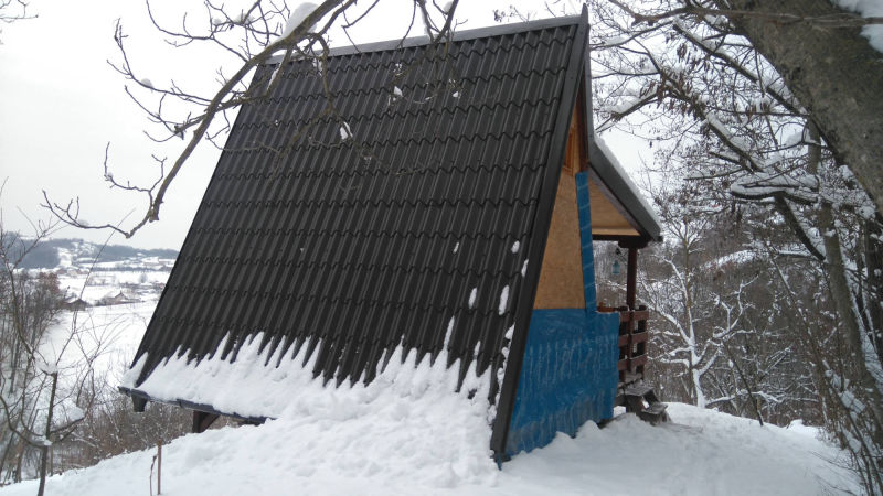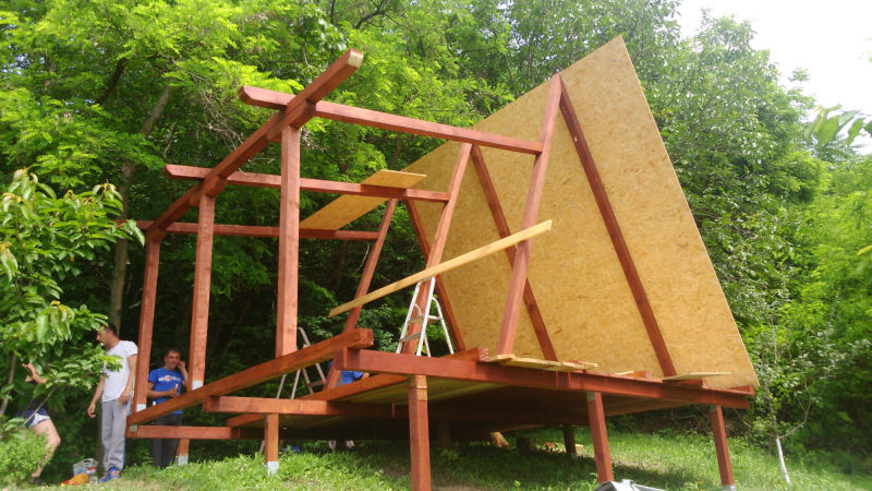 Kućica je izgrađena od drveta na devet metalnih šiljaka dužine 90 cm kao nosivim dijelom cijele konstrukcije.
