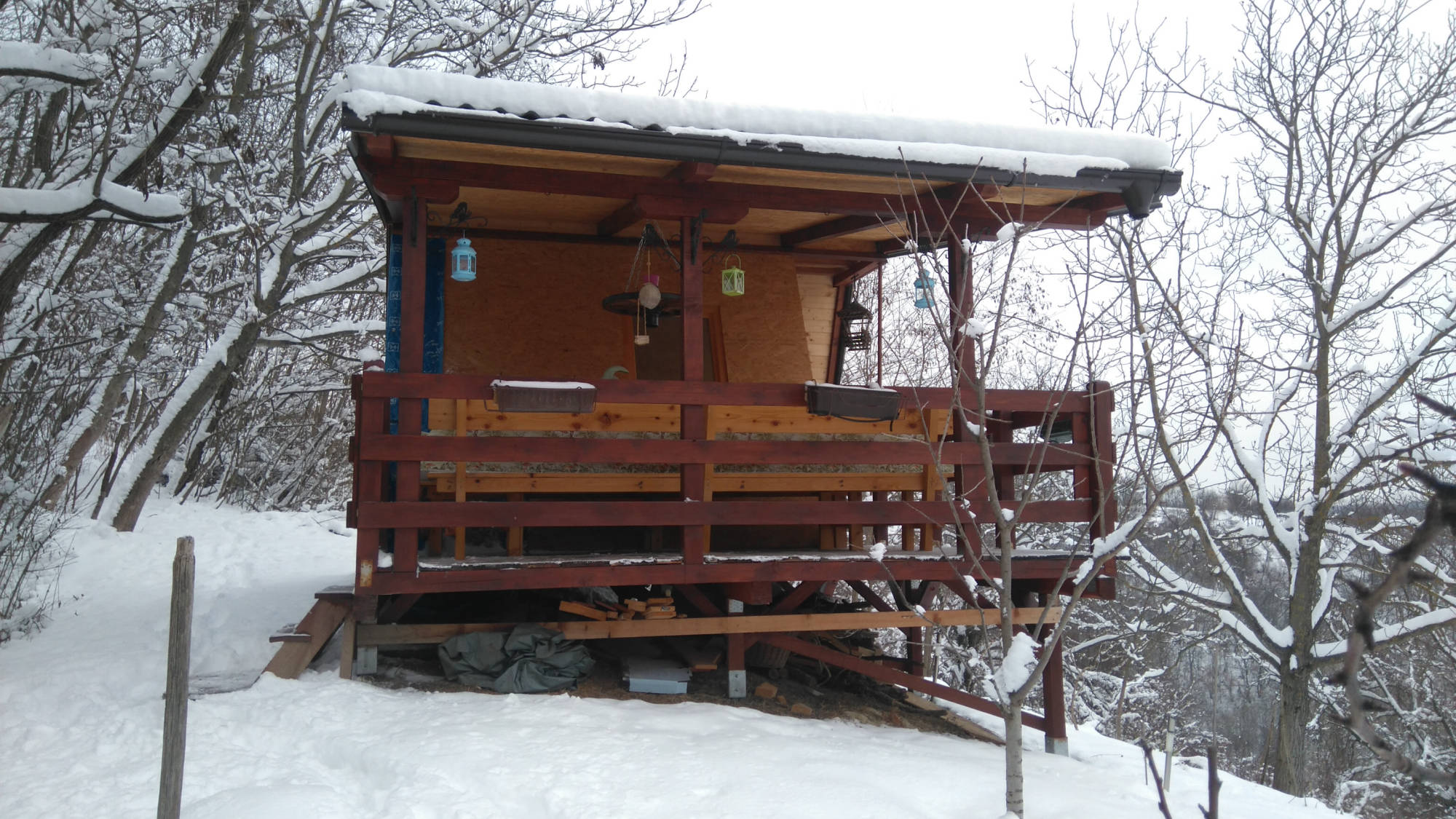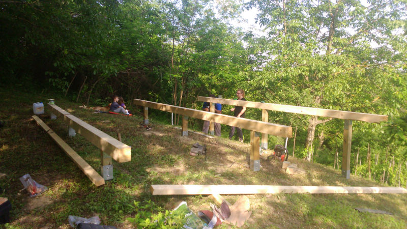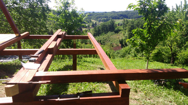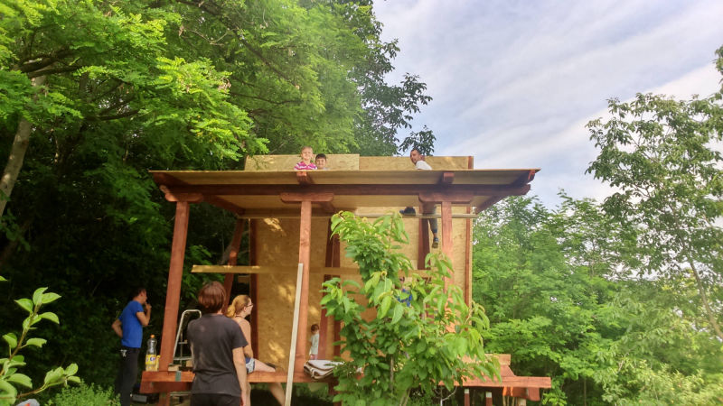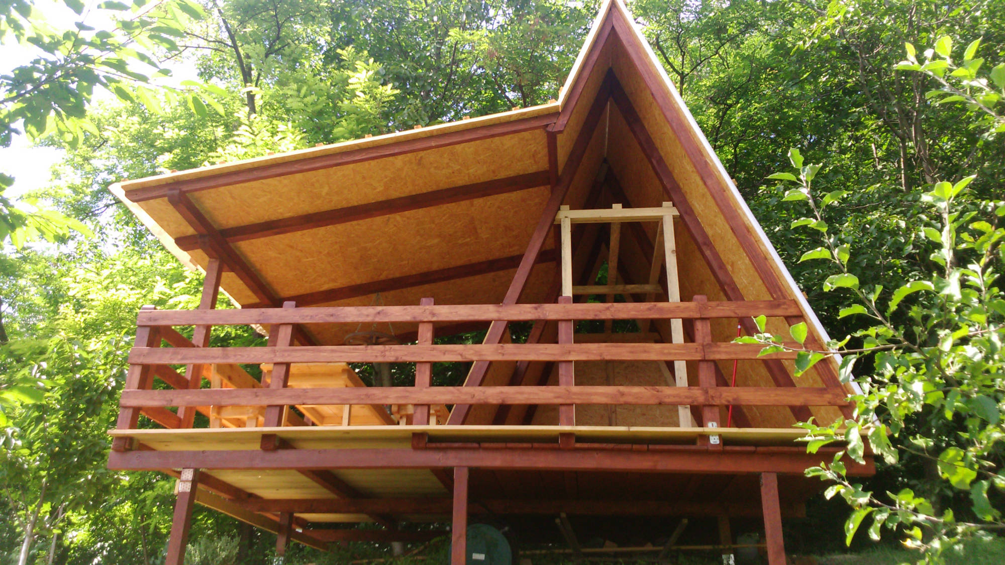 Kućica je izgrađena od drveta na devet metalnih šiljaka dužine 90 cm kao nosivim dijelom cijele konstrukcije.